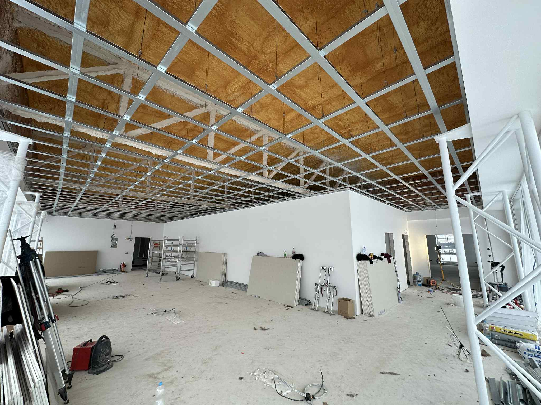 Montáž rovného podhledu v rodinném řadovém domě, provedeného ve špičkové kvalitě Q4 (celoplošného tmelení). Součástí prací byla také instalace osvětleného frézovaného kastlíku, vynechaného prostoru pro garnýž a příprava na klimatizaci.
